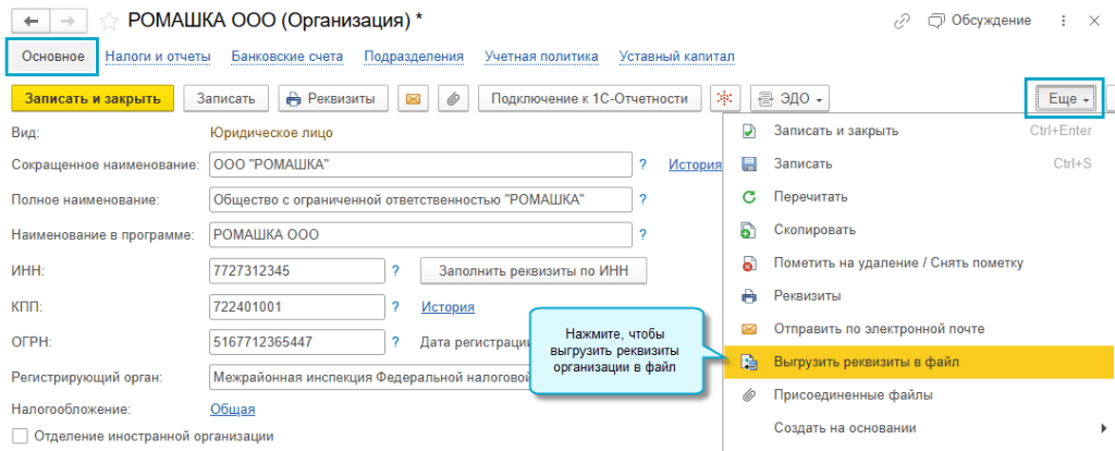 В программе «1С:Бухгалтерия 8» начиная с версии 3.0.184 добавлена возможность выгрузить реквизиты своей организации в файл без отправки по электронной почте.