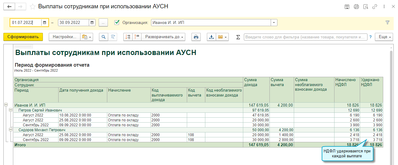 В программе «1С:Бухгалтерия 8» начиная с версии 3.0.124 добавлен отчет Выплаты сотрудникам при использовании АУСН с расшифровкой необлагаемых доходов, вычетов и НДФЛ.