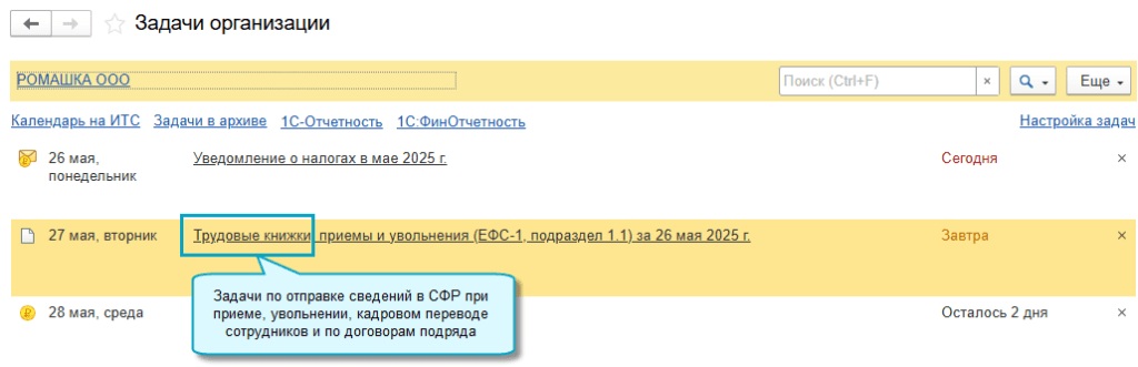 Переименованы задачи организации по их отправке в списке задач и в календаре отчетности. Теперь их наименование начинается с «Трудовые книжки…».