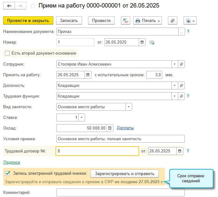 В программе «1С:Бухгалтерия 8» начиная с версии 3.0.176 теперь показывается крайний срок отправки в СФР сведений по форме ЕФС-1 подраздел 1.1 при приеме, увольнении, кадровых переводах сотрудников и по договорам подряда.