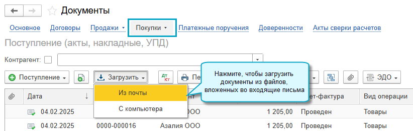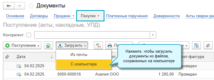 При загрузке с компьютера также можно выбирать несколько файлов разных форматов. Загрузка документов доступна в журналах документов Поступление (акты, накладные, УПД), Счета от поставщиков, Платежные поручения, а в простом интерфейсе еще и из общего журнала Документы.