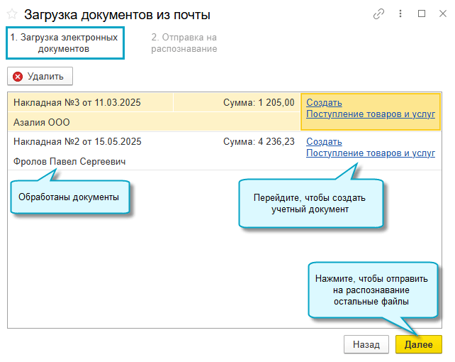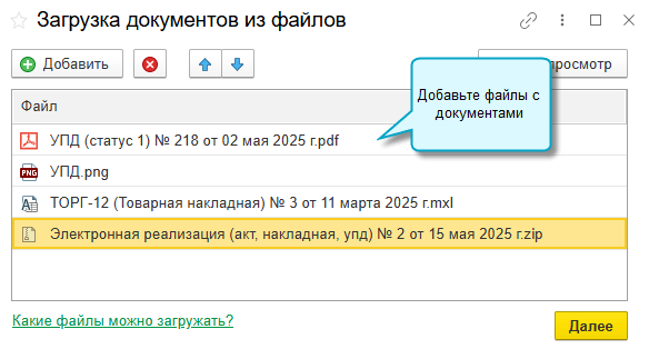 Сначала (как раньше) загружаются ТОРГ-12 и УПД из файлов с расширением xls, xlsx и mxl, а также файлов в формате, утвержденном ФНС. Остальные файлы загружаются с помощью сервиса 1С:Распознавание первичных документов, если он подключен.