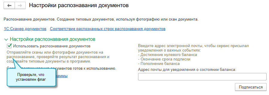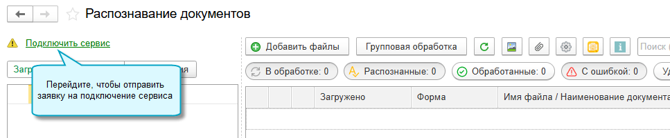 Если сервис 1С:Распознавание первичных документов не подключен, выполните следующие настройки: