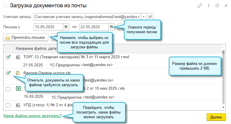 В программе «1С:Бухгалтерия 8» начиная с версии 3.0.176 стало удобнее загружать документы из электронной почты и с компьютера. Теперь не нужно отбирать и отдельно загружать сканы и фотографии для распознавания. При загрузке из почты обрабатываются вложенные в письма файлы всех подходящих форматов. Формат документа определяется автоматически.