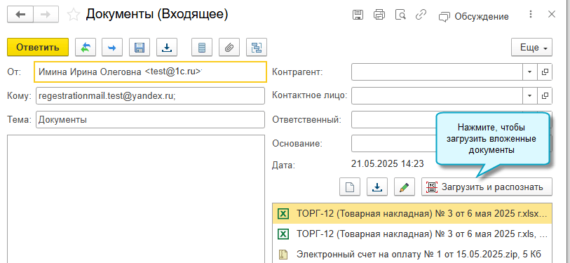 Из входящих писем, которые используются, когда включена функциональность «Взаимодействие с лидами и покупателями», теперь также можно передавать файлы на распознавание через сервис 1С:РПД.