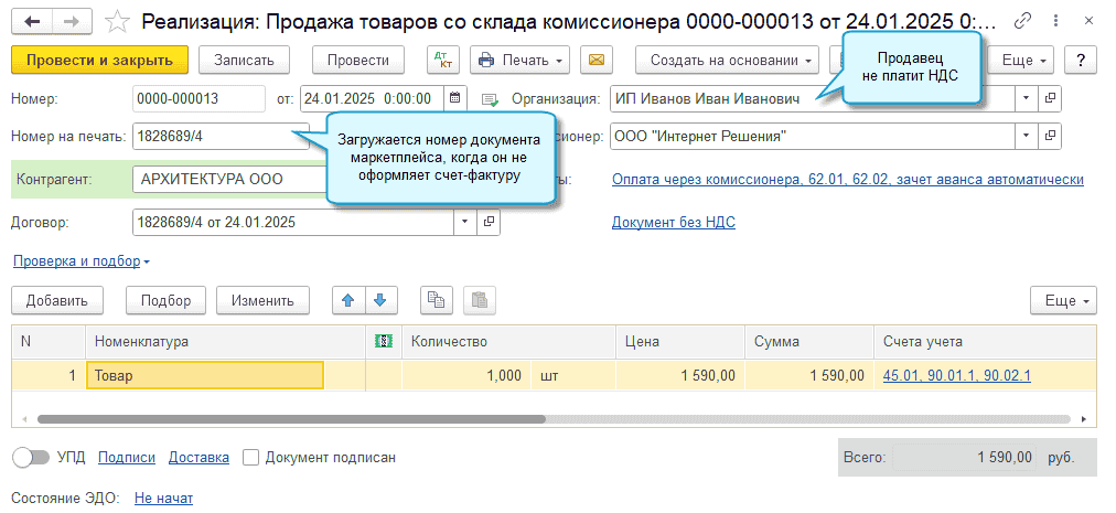В программе «1С:Бухгалтерия 8» начиная с версии 3.0.179 при загрузке продаж через маркетплейсы теперь отдельно обрабатываются и загружаются продажи товаров в адрес организаций и ИП. По таким продажам, в отличие от физических лиц, маркетплейсы оформляют для покупателей от имени продавца счет-фактуру или УПД.