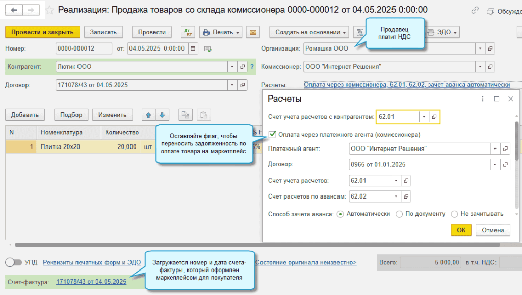 Реализация товаров отражается в учете в разрезе покупателей – организаций или ИП, а их задолженность по оплате товара переносится на маркетплейс, чтобы закрывать ее полученными от него деньгами.