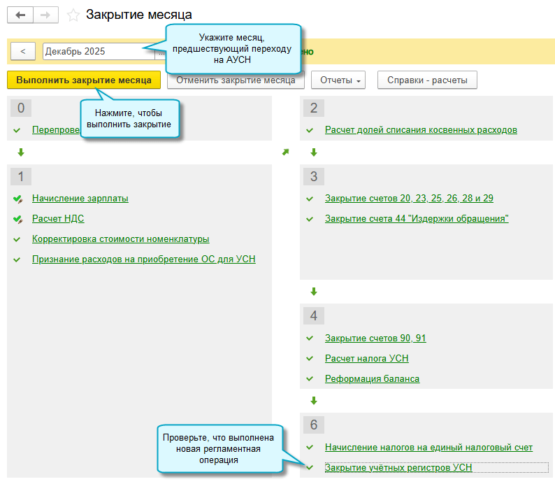 Полный интерфейс: меню «Операции – Закрытие периода – Закрытие месяца – Закрытие учетных регистров УСН».