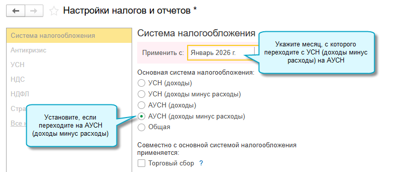 Полный интерфейс: меню «Главное – Настройки – Налоги и отчеты – Система налогообложения».