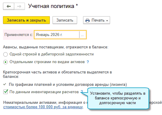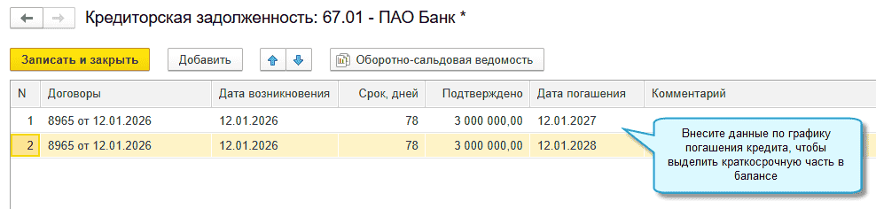 В программе «1С:Бухгалтерия 8» начиная с версии 3.0.195 добавлена возможность заполнить бухгалтерский баланс с разделением задолженности на долгосрочную и краткосрочную. Для этого в форму баланса добавлены показатели: