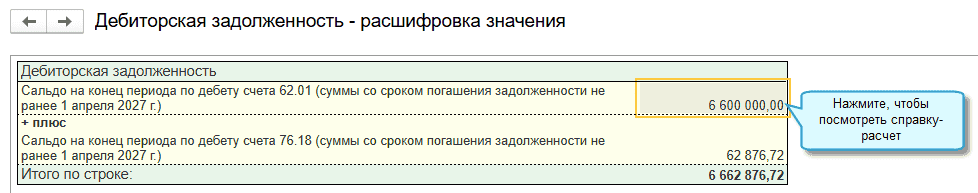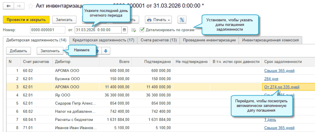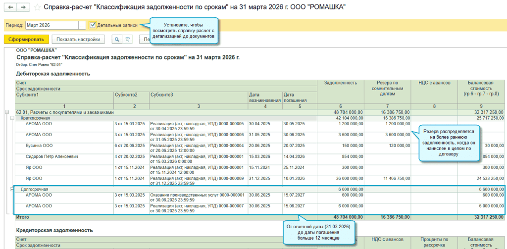 Краткосрочной признается задолженность, которая подлежит погашению в течение 12 месяцев после отчетной даты, долгосрочной – более 12 месяцев. Классификация задолженности по срокам осуществляется на основании дат погашения, указанных в документе Акт инвентаризации расчетов. Если в акте отсутствуют данные, то дата погашения определяется последовательно: по срокам оплаты, указанным в документе, если там нет - по сроку оплаты в карточке договора, если там нет - по срокам оплаты, указанным в настройках параметров ведения учета для долгов покупателей и долгов перед поставщиками.