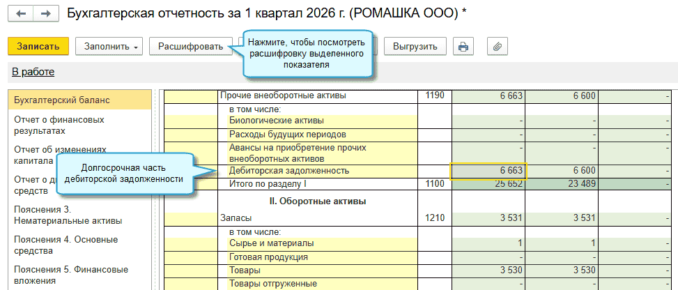 - «Дебиторская задолженность» в группу «Прочие внеоборотные активы» (код строки 1190) для отражения долгосрочной части,