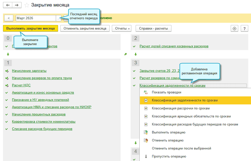 Полный интерфейс: меню «Операции – Закрытие периода – Закрытие месяца – Классификация задолженности по срокам».