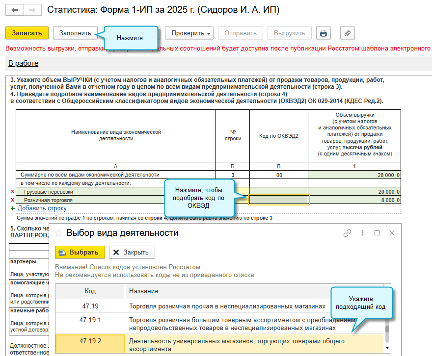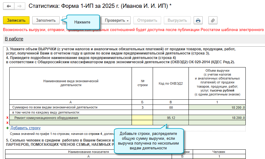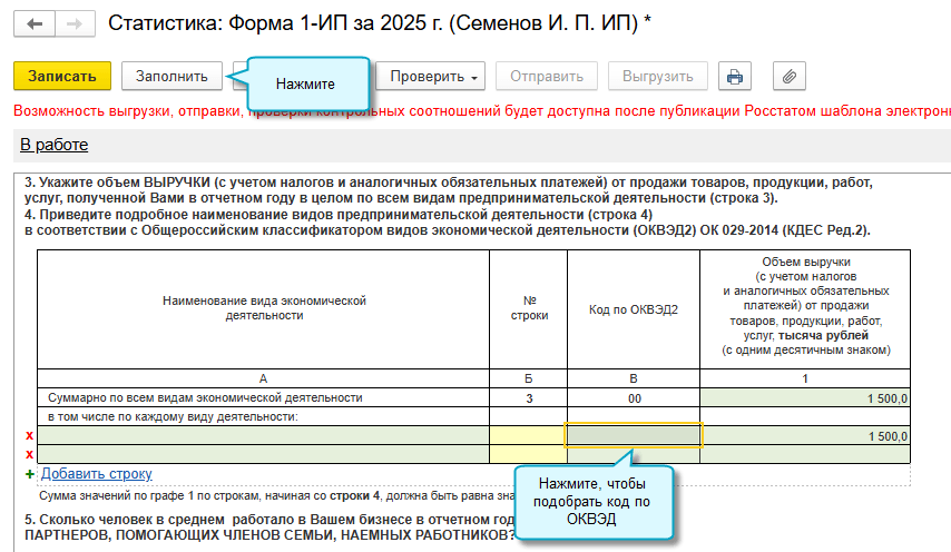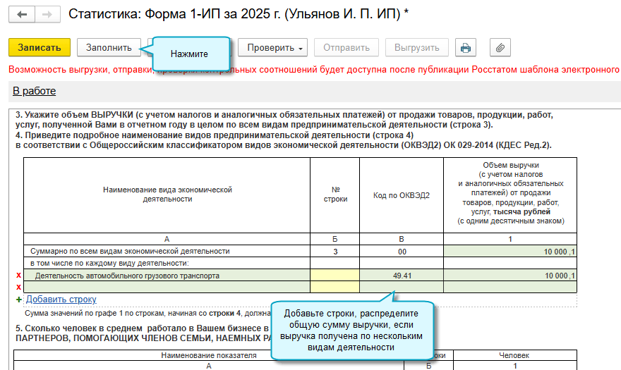 В программе «1С:Бухгалтерия 8» начиная с версии 3.0.190 добавлено автозаполнение сведений о выручке индивидуального предпринимателя в форме №1-ИП (годовая). Действует форма с 01.01.2026 начиная с отчета за 2025 год (приказ Росстата от 22.07.2025 №349).