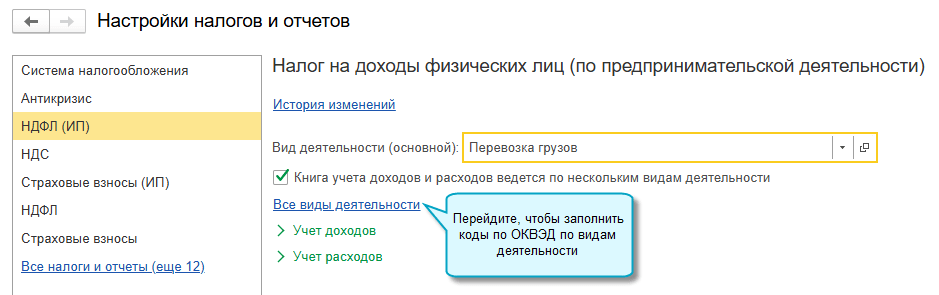 Сумма выручки заполняется по данным Книги учета доходов и расходов. Для распределения выручки по кодам ОКВЭД используются настройки видов деятельности.