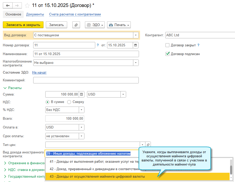 В программе «1С:Бухгалтерия 8» начиная с версии 3.0.190.2 добавлен код дохода 43 «Доходы от осуществления майнинга цифровой валюты, полученной в связи с участием в деятельности майнинг-пула». Раньше для таких доходов иностранных организаций использовался код 39.