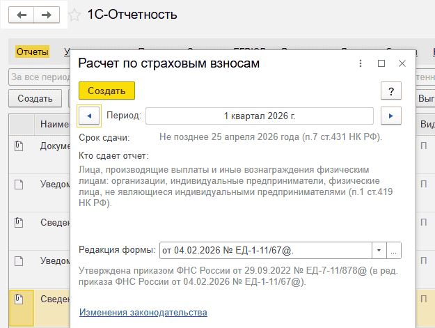 В программе «1С:Бухгалтерия 8» начиная с версии 3.0.195 добавлено автозаполнение расчета по страховым взносам по форме, утвержденной приказом ФНС России от 29.09.2022 №ЕД-7-11/878@ (в редакции приказа от 04.02.2026 №ЕД-1-11/67@).