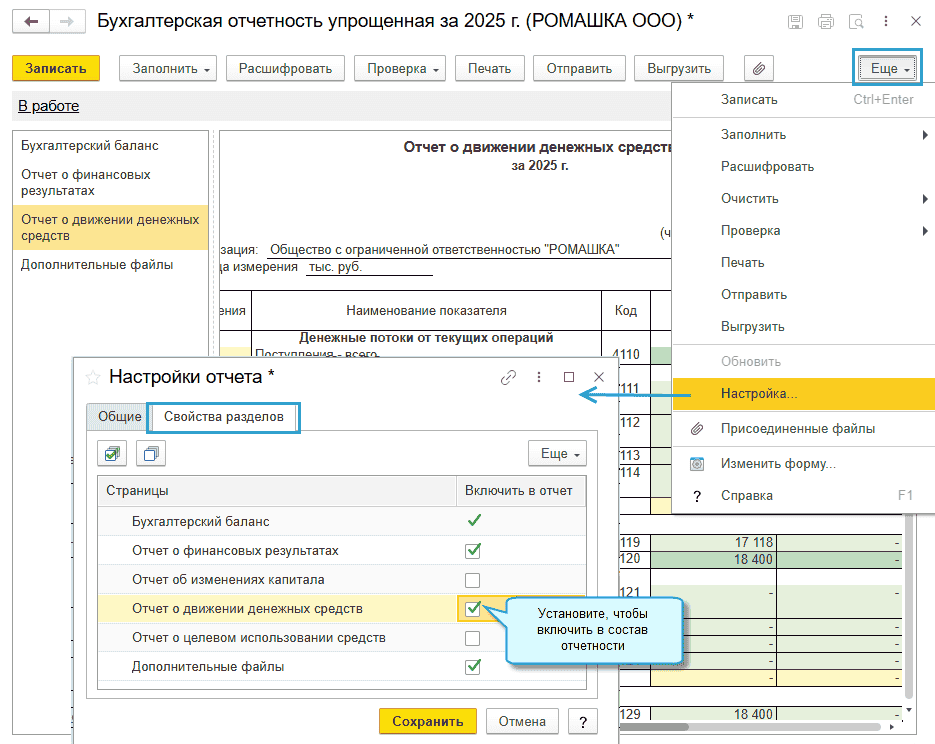 Добавлено автозаполнение Отчета о движении денежных средств и Отчета об изменении капитала, когда они включаются в упрощенную бухгалтерскую отчетность из-за существенности входящей в них информации (п. 54 ФСБУ 4/2023). Заполняются они по правилам полной бухгалтерской отчетности по ФСБУ 4/2023.