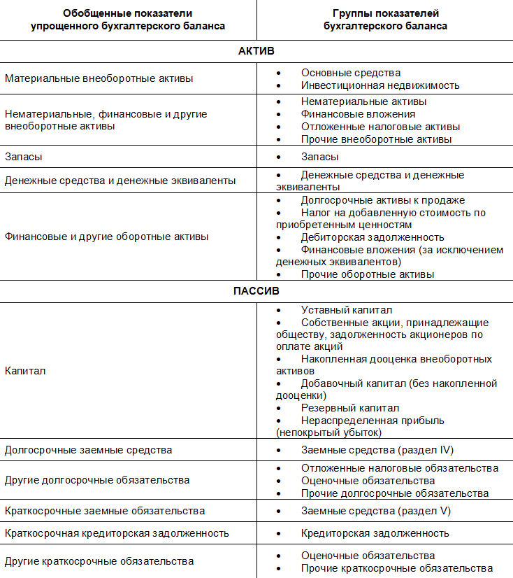 Соответствие показателей упрощенного бухгалтерского баланса и обычного смотрите в следующей таблице.