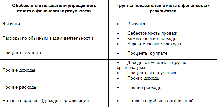 Соответствие показателей упрощенного отчета о финансовых результатах и обычного смотрите в следующей таблице.