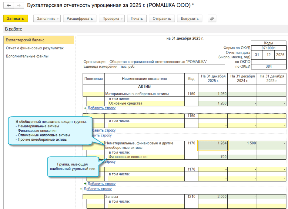Показатели упрощенной бухгалтерской отчетности формируются путем объединения групп показателей полной бухгалтерской отчетности (п.53 ФСБУ 4/2023). Из обобщенного показателя автоматически выделяется группа с наибольшим удельным весом (п.64 ФСБУ 4/2023).