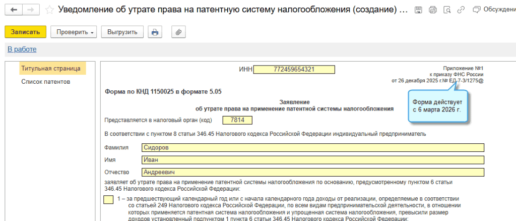 В программе «1С:Бухгалтерия 8» начиная с версии 3.0.193 обновлена форма заявления об утрате права на применение патентной системы налогообложения.